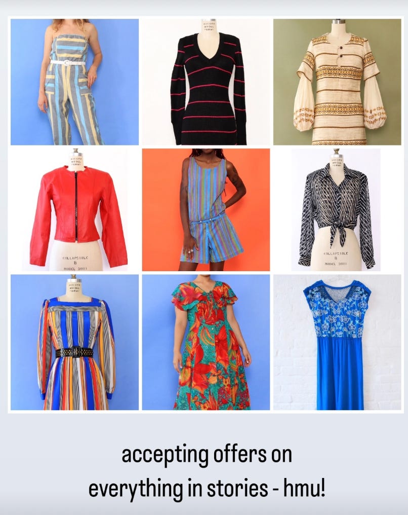 I think the best grabs from above are the knit long sleeve dress (top-middle), 1980s leather jacket (left middle), the dropped waist striped romper (middle-middle), and the 1980s long sleeve blouse and skirt set (left-bottom).